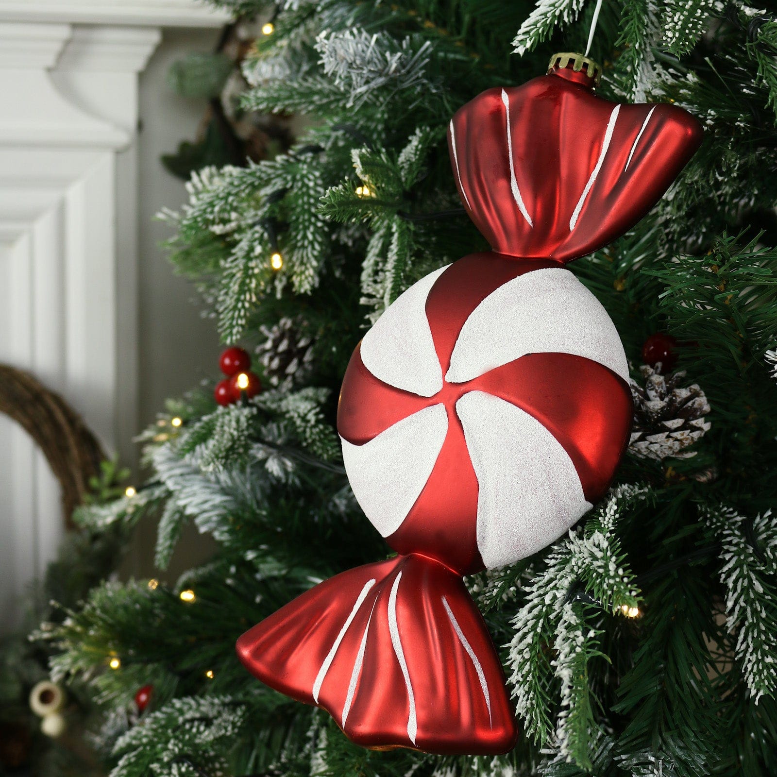 Create a sensational sweet statement with this extra large Christmas Candy Bauble from the Mr Crimbo range. The giant wrapped Christmas Sweet decoration is a magnificent 30cm long and features shiny red wrapper ends with a shiny white glitter pinwheel design in the centre. The huge Christmas tree candy bauble is perfect for adding a charming splash of festive cheer to any room. The red and white large Candy hanging decoration is made using strong and durable plastic that is shatterproof and will last year after year.