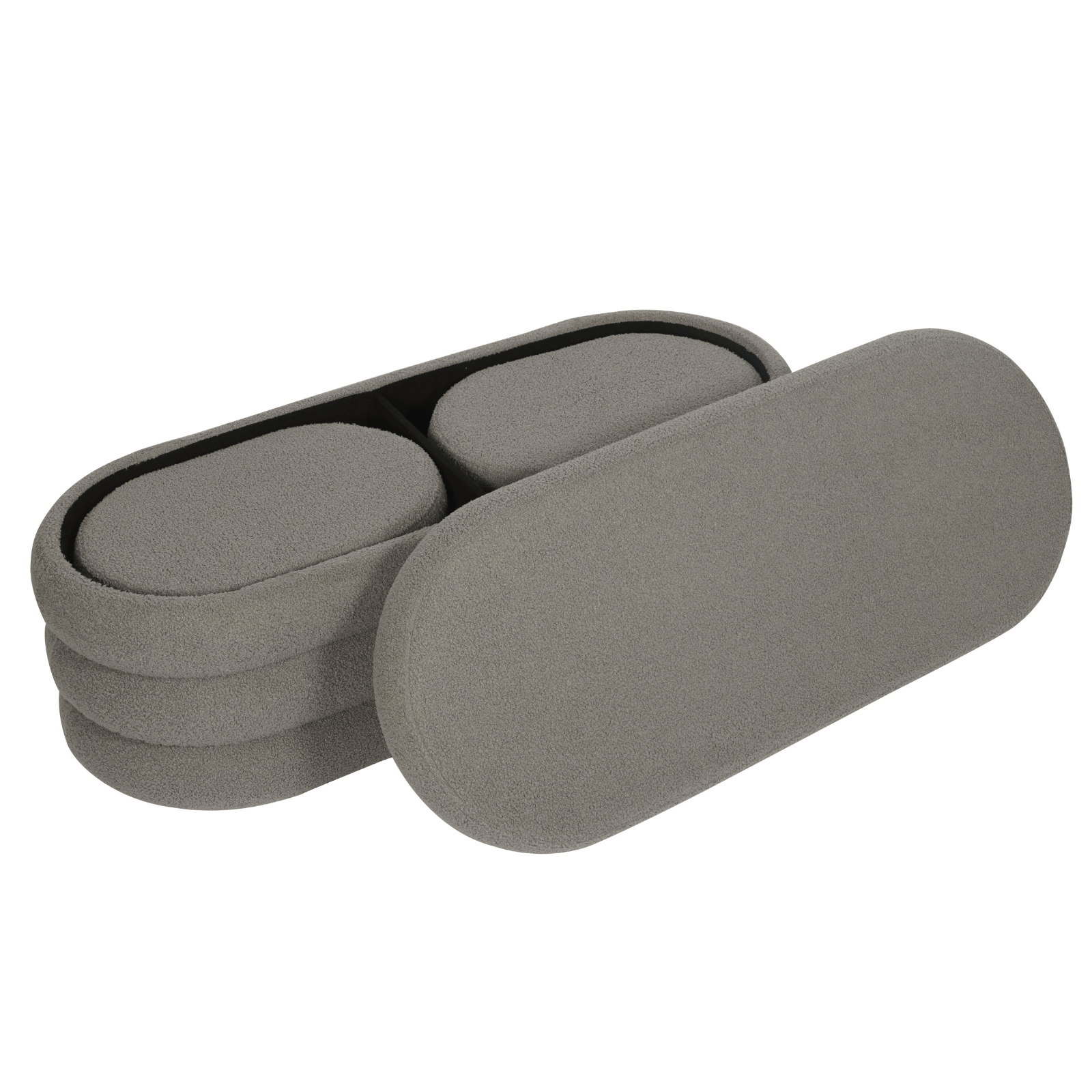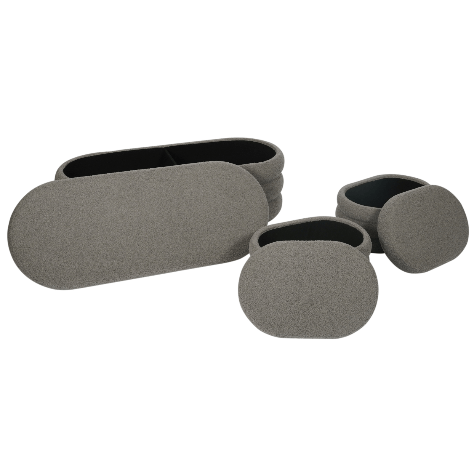 Save space in style with this Set of 3 Teddy Ribbed Storage Stools & Ottoman from Hodge & Hodge. Designed to be as versatile as it is stylish, this clever nested set features one large oval ottoman with two smaller storage stools hidden inside. Each piece doubles up as seating, while providing plenty of hidden storage for everything from bed linens and blankets, to beauty essentials, books, or magazines. Wrapped in soft teddy plush fabric with a contemporary curved shape and ribbed detailing, this set adds cosy texture and modern design to your home. Whether styled at the end of your bed, under a dressing table, or in the living room, these ottomans are a chic and practical addition to any interior. Available in natural or grey, the neutral palette makes them easy to style with any decor.