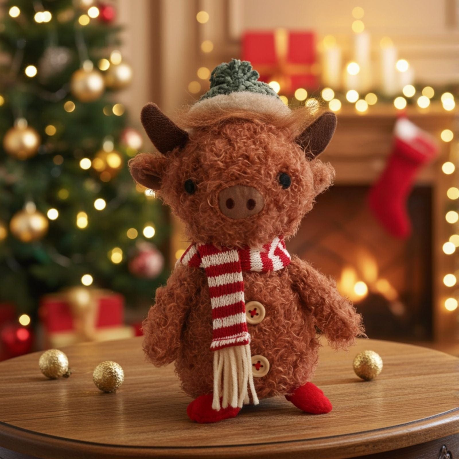 • Plush fabric sitting Highland Cow figure Christmas decoration