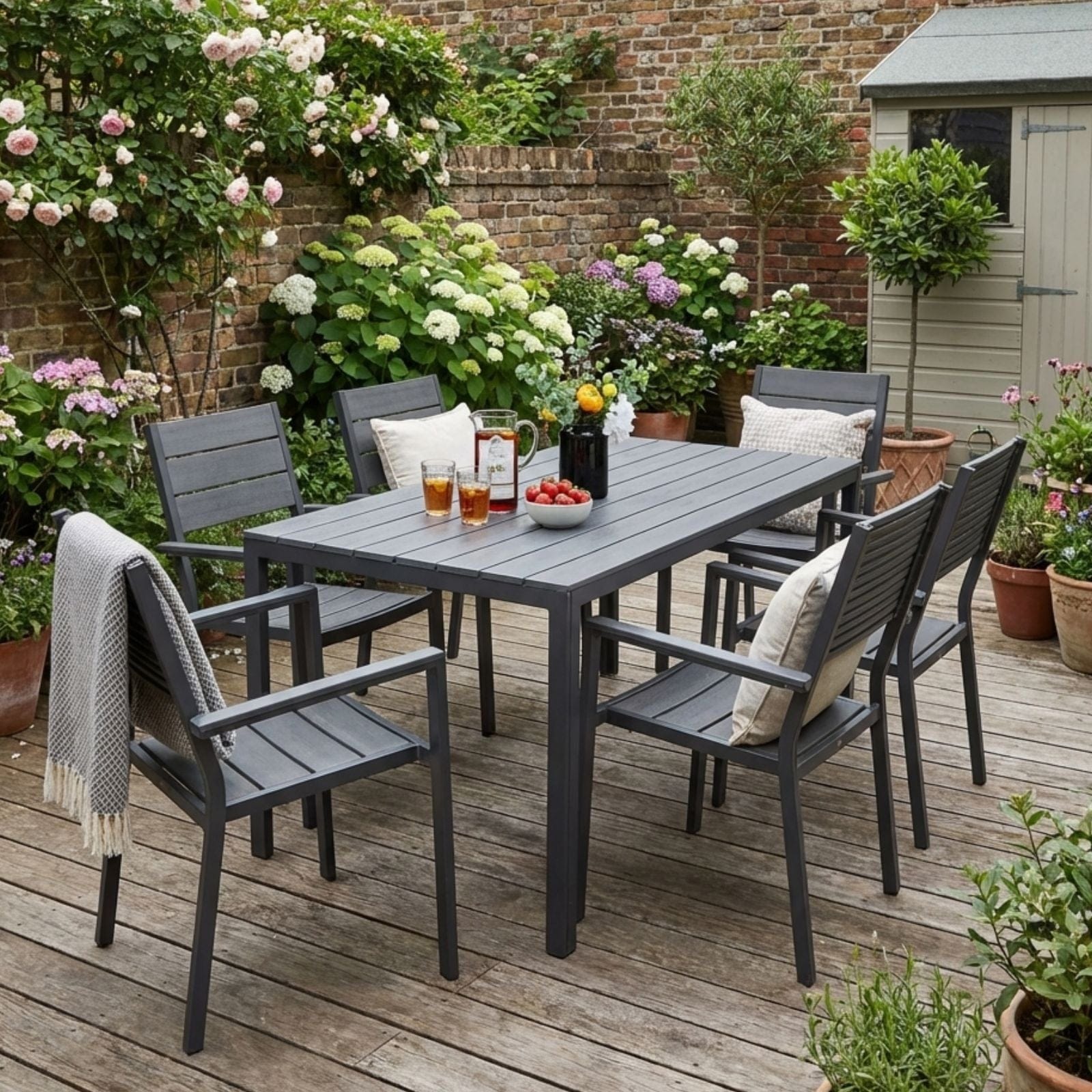 Make the most of your outdoor living space with the Santillana Garden Set. Inspired by the warmth and hospitality of the Northern coast of Spain, this 7-piece set from Azuma will add a touch of elegant style to your garden. The steel-framed table and chairs feature durable, resilient blow-moulded panels with a wood grain effect, making them ideal for outdoor use. With two carver chairs and four standard chairs, the Santillana outdoor dining set comfortably seats six adults. Available in either grey or natural, it's the perfect place for family barbecues or long, relaxing lunches in the sun.