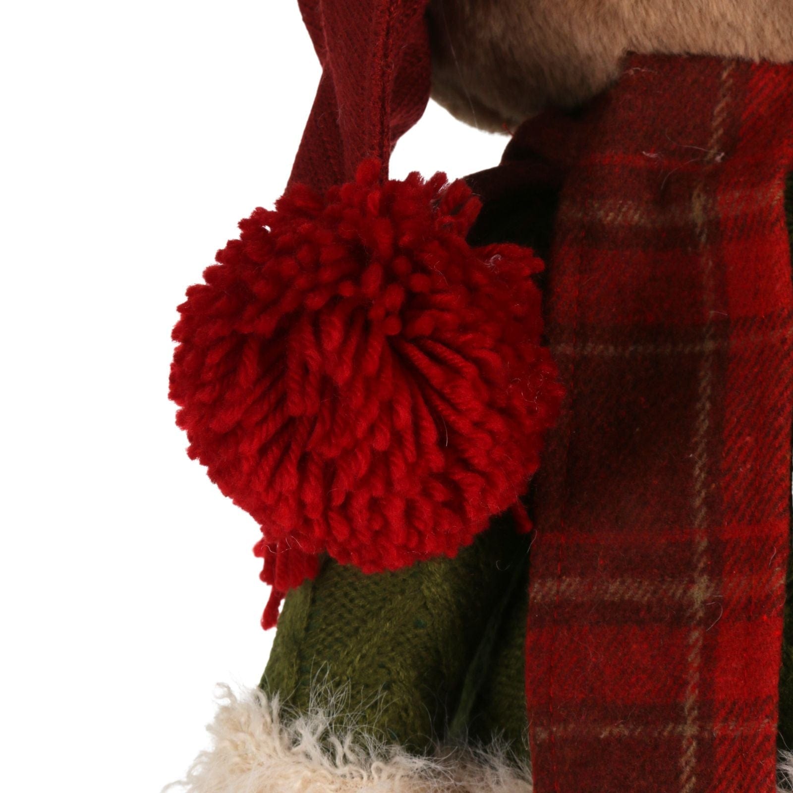 This extra large plush Christmas bear from the Mr Crimbo range is just so cute! The adorable big standing bear decoration is made from soft fabrics and knits in festive red, white and green. The 86cm tall Christmas bear wears a green chunky knit jumper with fluffy trim, a red tartan scarf and a red pixie hat with pom poms and white embroidered snowflakes. Perfect for greeting Christmas visitors in your porch, hallway or living room.