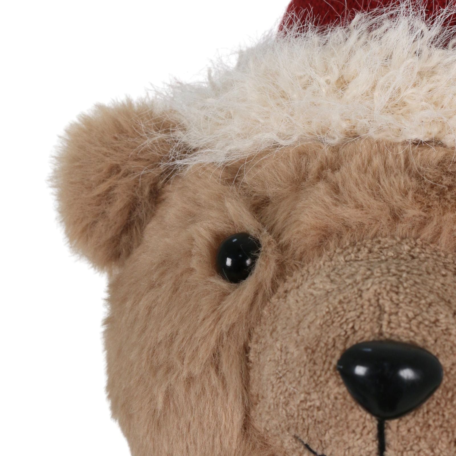 Everyone loves a teddy bear and this large plush Christmas bear is simply adorable. The cute standing bear decoration is made from soft fabrics and knits in festive red, white and green. The 56cm tall Christmas bear wears a green chunky knit jumper with fluffy trim, a red tartan scarf and a red Santa hat with jingle bell. Perfect for placing on a hall table or beside your fireplace to make a big impression on your Christmas visitors.