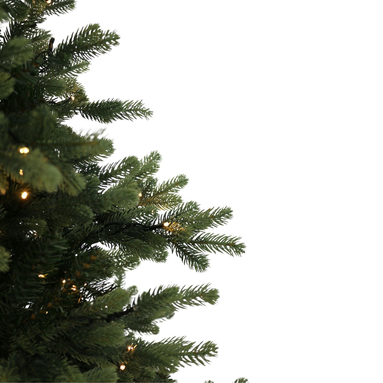 Close-up of a green Christmas tree with lights on a white background
