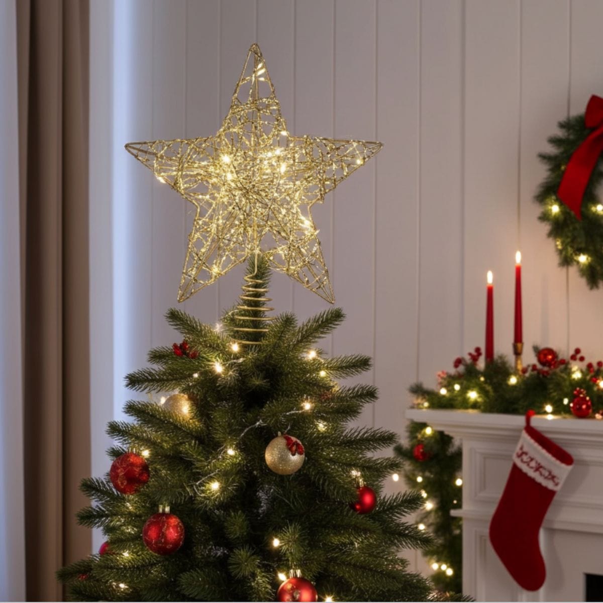 Give your Christmas tree a stunning finishing touch with the Mr Crimbo Gold Metal Star Light Up Tree Topper. Designed with a sturdy gold metal frame and wrapped in stylish PET wire, this elegant topper is illuminated with 20 warm white copper wire LEDs that create a magical festive glow. Battery powered with a built-in timer (6 hours on / 18 hours off), it’s effortlessly easy to use and hides neatly at the back of your tree for a clean, seamless look. The strong metal spring base ensures it fits securely onto the top branch of your tree, making it the perfect addition to both contemporary and traditional Christmas themes. Reusable year after year, this star topper brings instant festive charm to your seasonal display.
