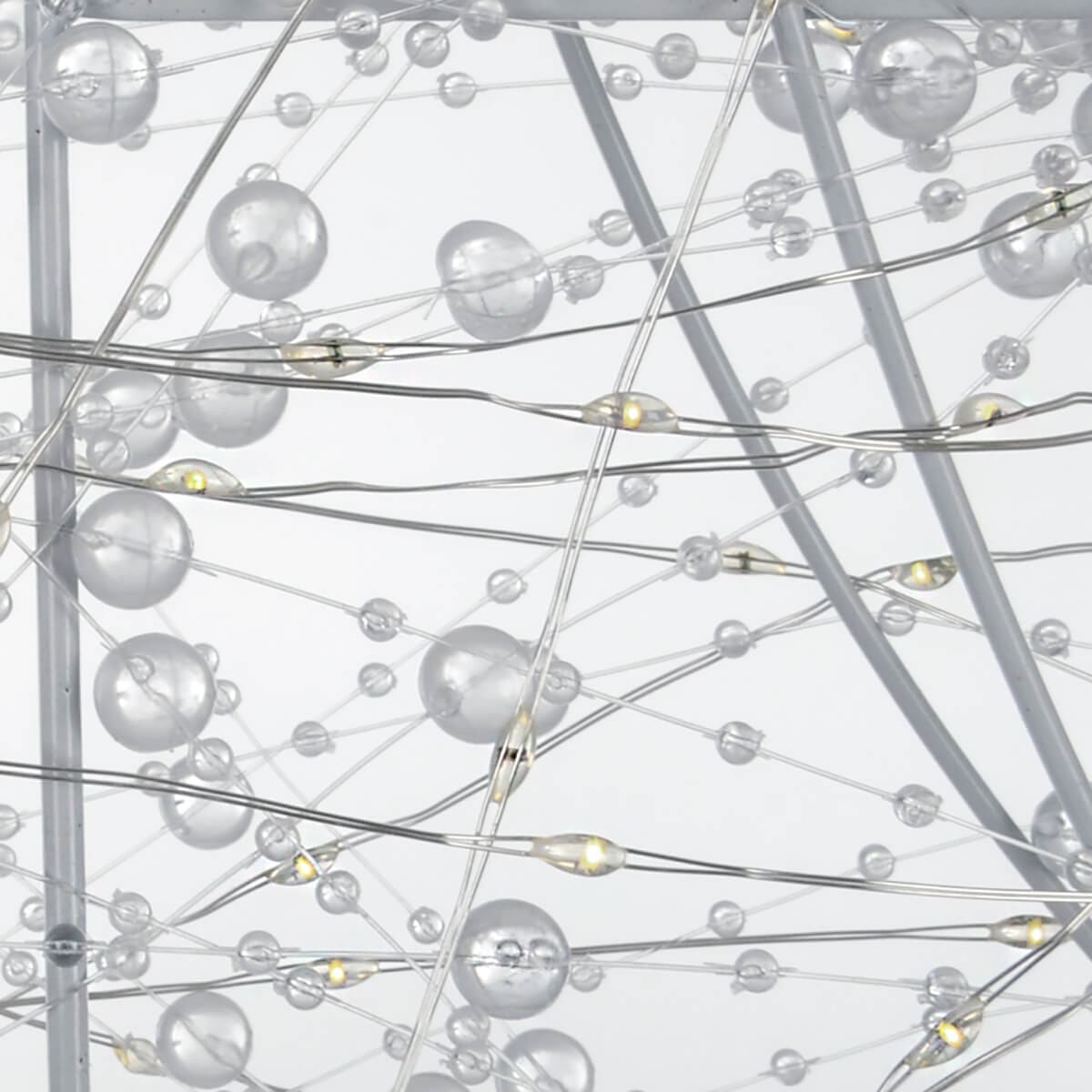 Close up of beads and LED lights on a white wire frame Christmas tree