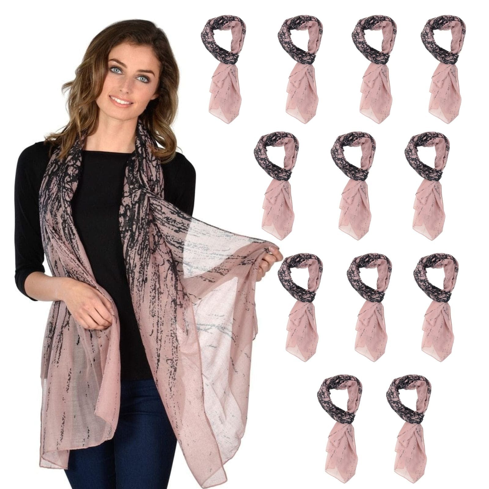 Bulk Pack 12 Womens Pink Black Abstract Print Sheer Scarf Lightweight