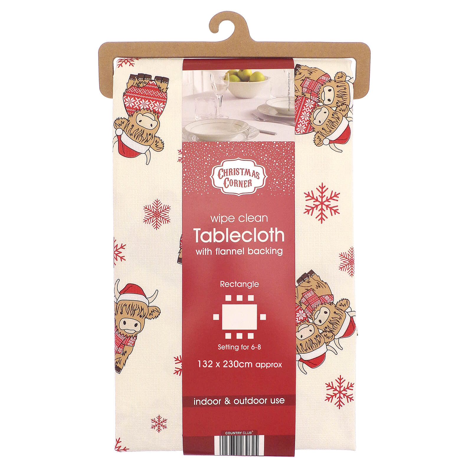 Add a delightful cover to your Christmas dining table with this large Wipe Clean Tablecloth from Country Club. The festive tablecloth will protect your table from spills and scratches and it looks great too. This Christmas tablecloth has an easy to clean PEVA surface with a flannel backing to prevent it sticking to your table. Available in a choice of red berry or Highland Cow designs, this 132 x 230cm large rectangle tablecloth can be used indoors or out in the garden if you're planning a Christmas barbecue!