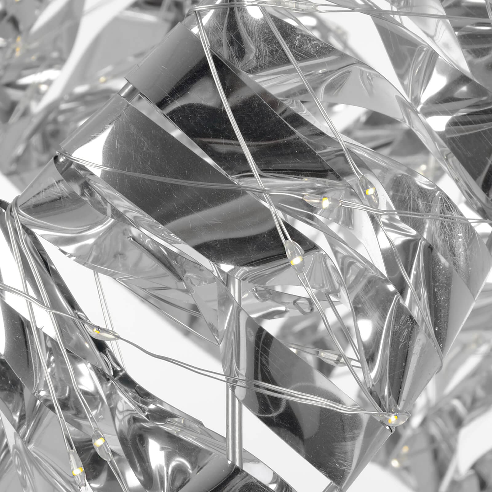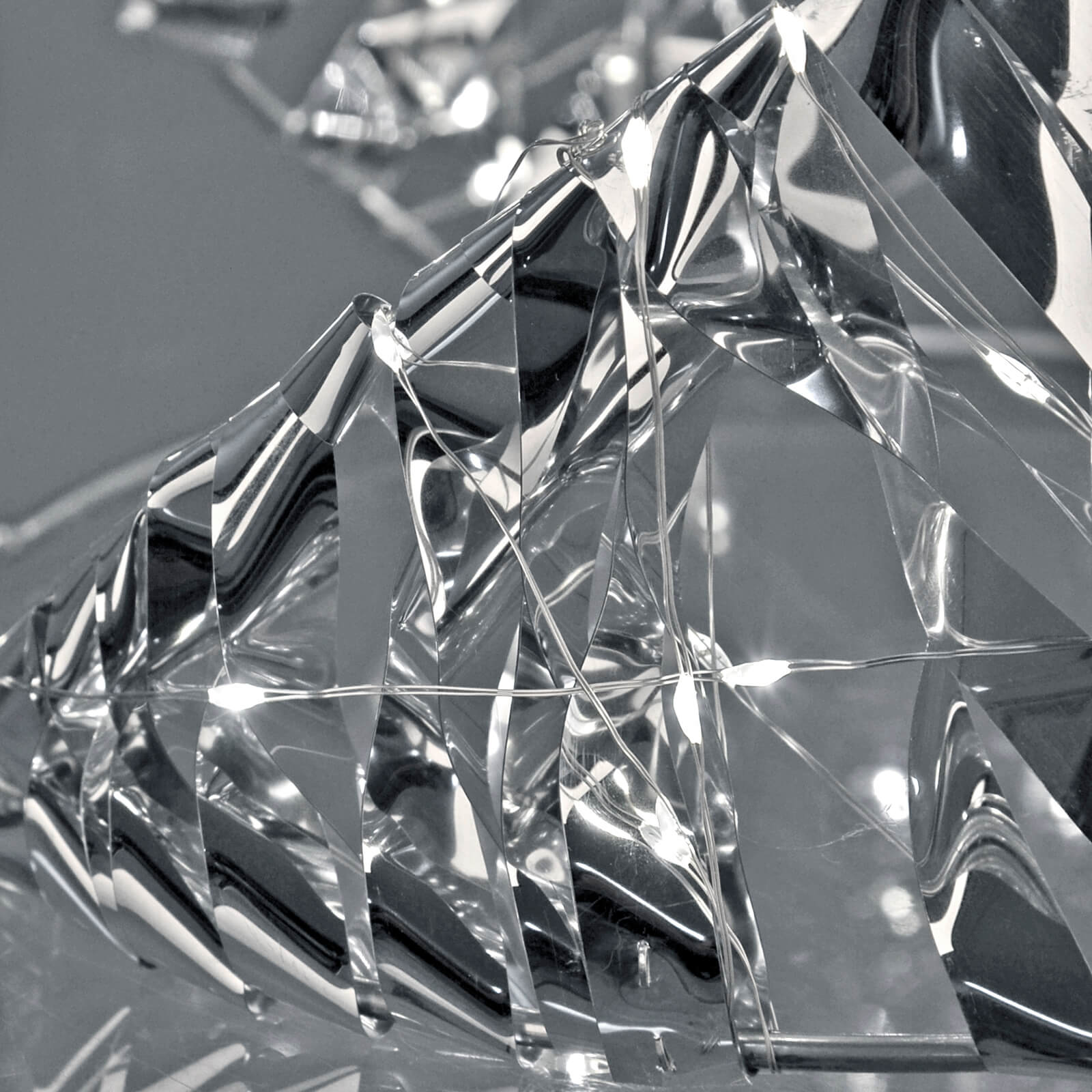 Close up of silver geometric shapes with LED light strings