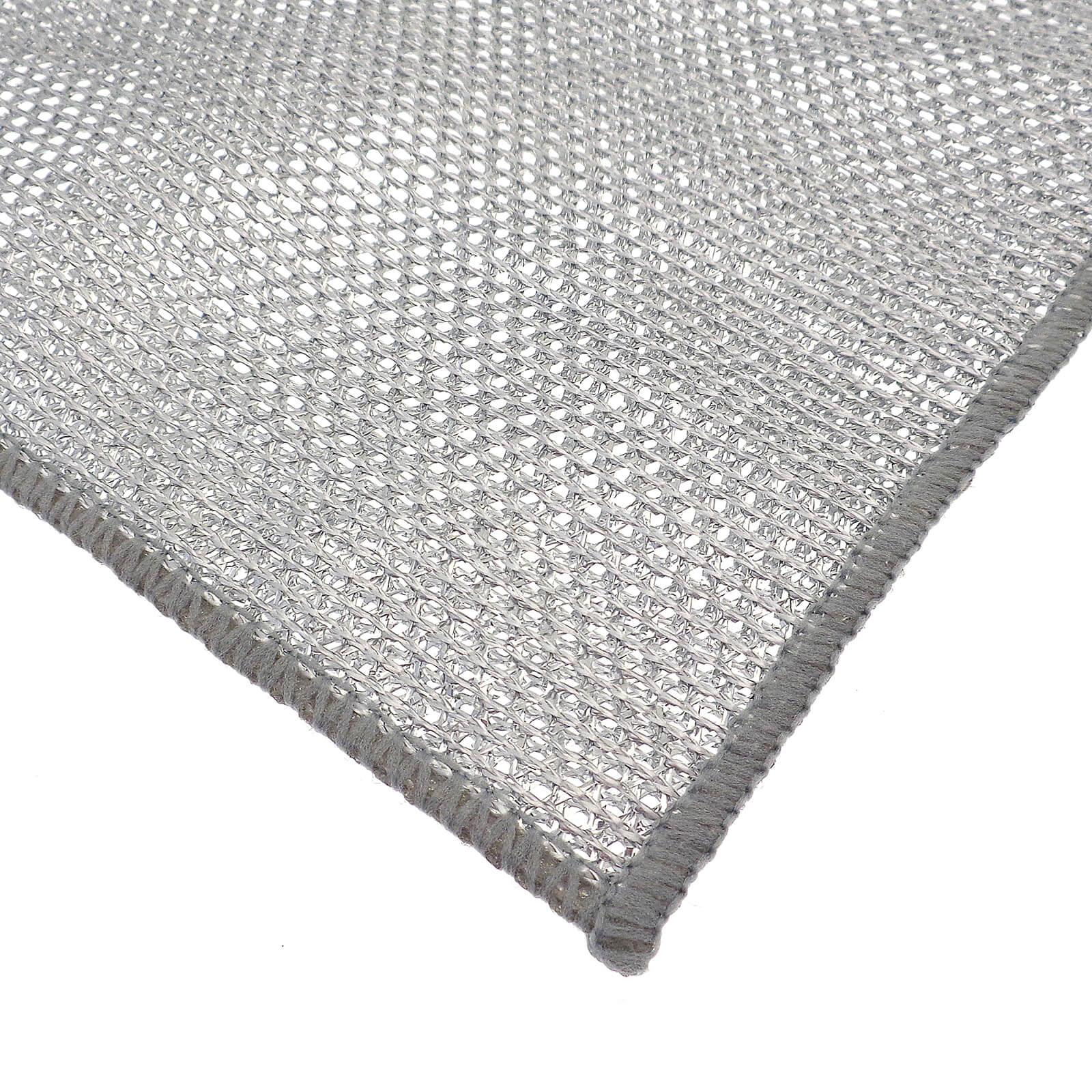 Close-up of a textured silver open weave cleaning cloth on a white background