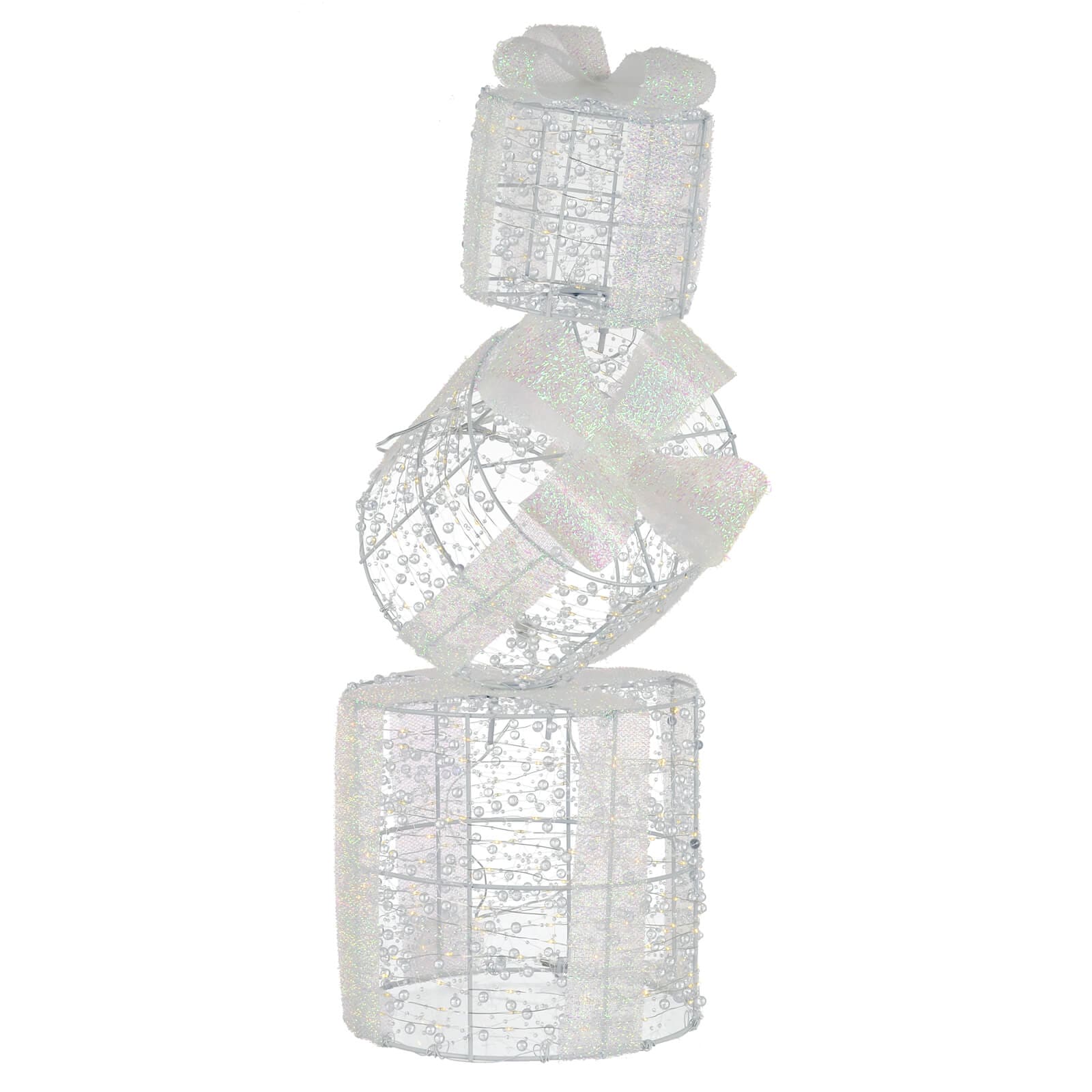 Make your festive display truly shine with this Set of 3 Stacking Light Up Gift Boxes from Mr Crimbo. Standing at 66cm tall, this elegant decoration features three rounded gift boxes stacked together and wrapped in 350 warm white copper wire LED lights. Finished with sparkling silver glitter bows and clear crystal-style beads, the design adds a luxurious touch to any Christmas scene. Perfect for greeting guests at the front door, styling in hallways, or creating a standout feature beside your Christmas tree. With a built-in 6hr on/18hr off timer function, these stacking boxes deliver a warm festive glow with zero effort. A stunning showpiece for both indoor and outdoor use.